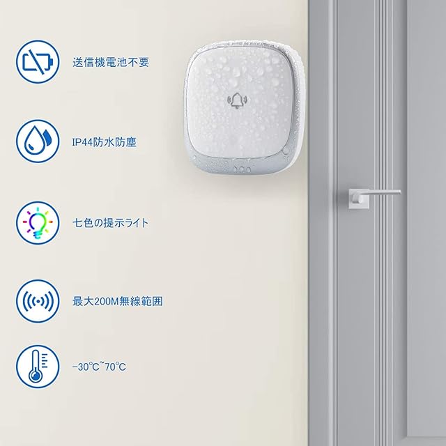 【7色の光と38曲選択可能の音で呼び出し】玄関チャイムの発信機を押せば、呼出し音が鳴ると同時に、7色のLEDランプが点滅してお知らせします。老人か耳の不自由の方に大変便利です。メロディーと38曲からお選びいただけます。受信機の音がない場合で、送信機とリペアリングして解決できます。方法:受信機の音量ボタンを長押し続き送信機を押してペアできます。あるいは直接店のカスタマに連絡していいです。