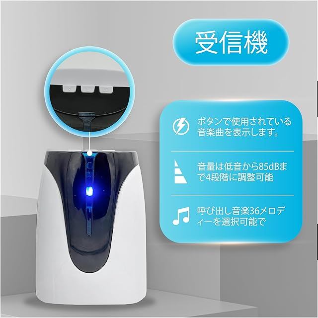 安定な転送:こちらの呼び出しチャイムは障害のない場所で、ワイヤレス通信が最大300メートルの長距離まで届けます。高感度受信機で、壁、木ドアー、鋼ドアーなどに安定受信でき、2階建ての建物でもご使用いただけます。