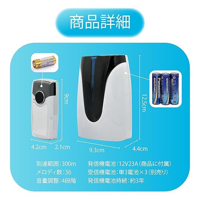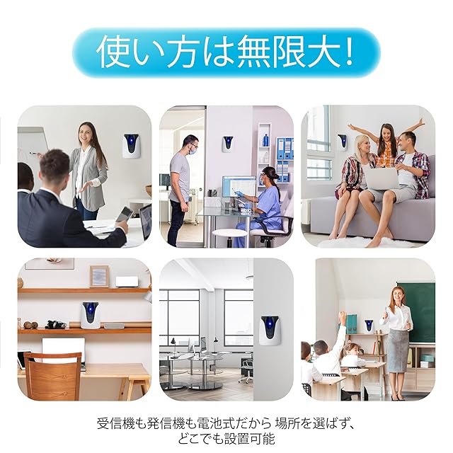 基本機能:玄関チャイム、来客チャイム、ナースコール、介護現場やレストラン、倉庫などでの呼び出しチャイムとして配線無しでラクラク設置できるワイヤレスチャイムです。家のどこにいてもチャイム音を聞き逃すことがありません。自宅、事務所、工場、介護現場、店舗、レストラン、居酒屋などにも最適です。