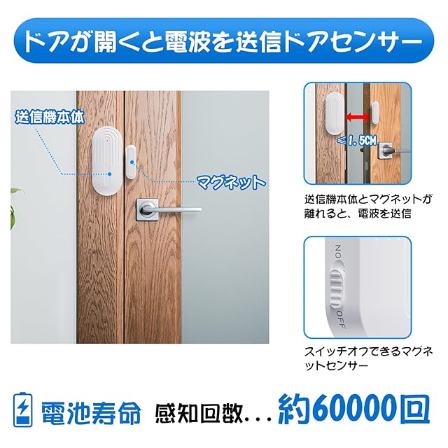 【簡単取り付け】開閉センサーを玄関ドアに貼り付け、受信機をコンセントに刺すだけなので、非常に簡単に取付出来ます。最大音量110dBに調節して侵入者を追い払ったり、フラッシュのみのサイレントモードに調節して赤ちゃんの眠りをケアしたりできます