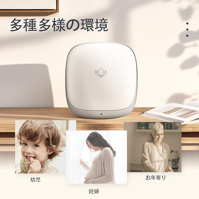 【ラクラクな取付】無線チャイムで配線工事が不要です。電池交換の不便もなくて、ドアチャイム受信機はコンセントに差し込むだけで、送信機をドアフレームに固定し(両面テープでの接着可能)ボタンを押すだけでチャイムが流れます。設置が簡単で手軽です。お子供や年寄りの方もご利用できます。うちのワイヤレスチャイムはご自宅、お風呂、介護現場、飲食店はもちろん、事務所や倉庫などで活躍します。