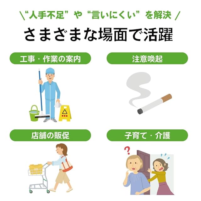 【出荷時の音声での活用方法】(シーン1)介護施設にて「足元にご注意ください」(シーン2)駅やショッピングモールのトイレ清掃中にて「清掃中です。ご協力お願いいたします」(シーン3)コンサート会場等にて「この会場は撮影・録画・録音は禁止です」