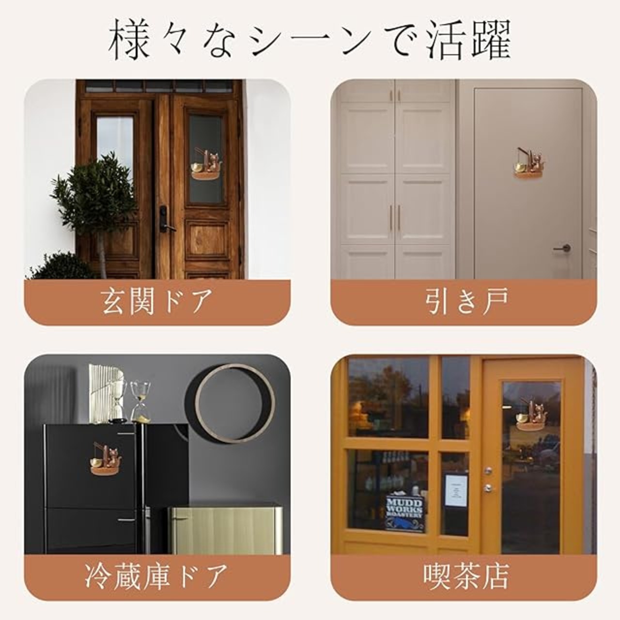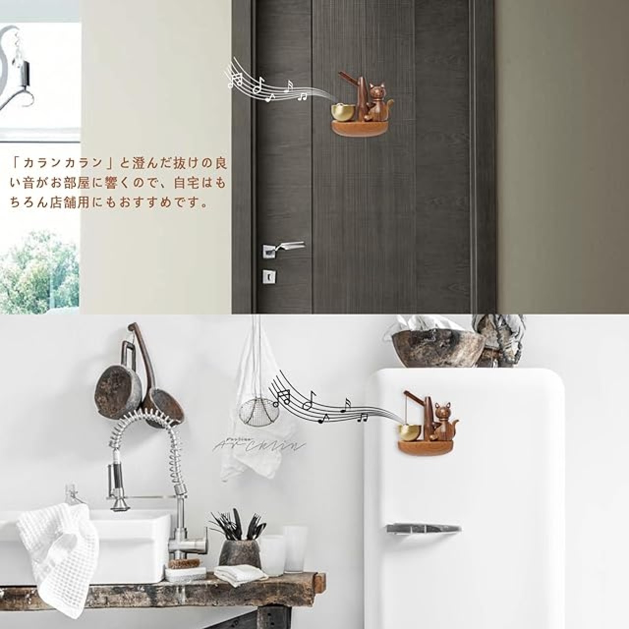 【スタイリッシュなデザイン】キュートな子猫型が存在感を放つ,超かわいい。てのひらに乗るコンパクトなドアベル。ドアを開けた時、程良い音色がします。小さめシンプルな形で作りもキレイ 。普通のドアに貼って鳴ってくれだけでなく、引き戸でも音を立てます。