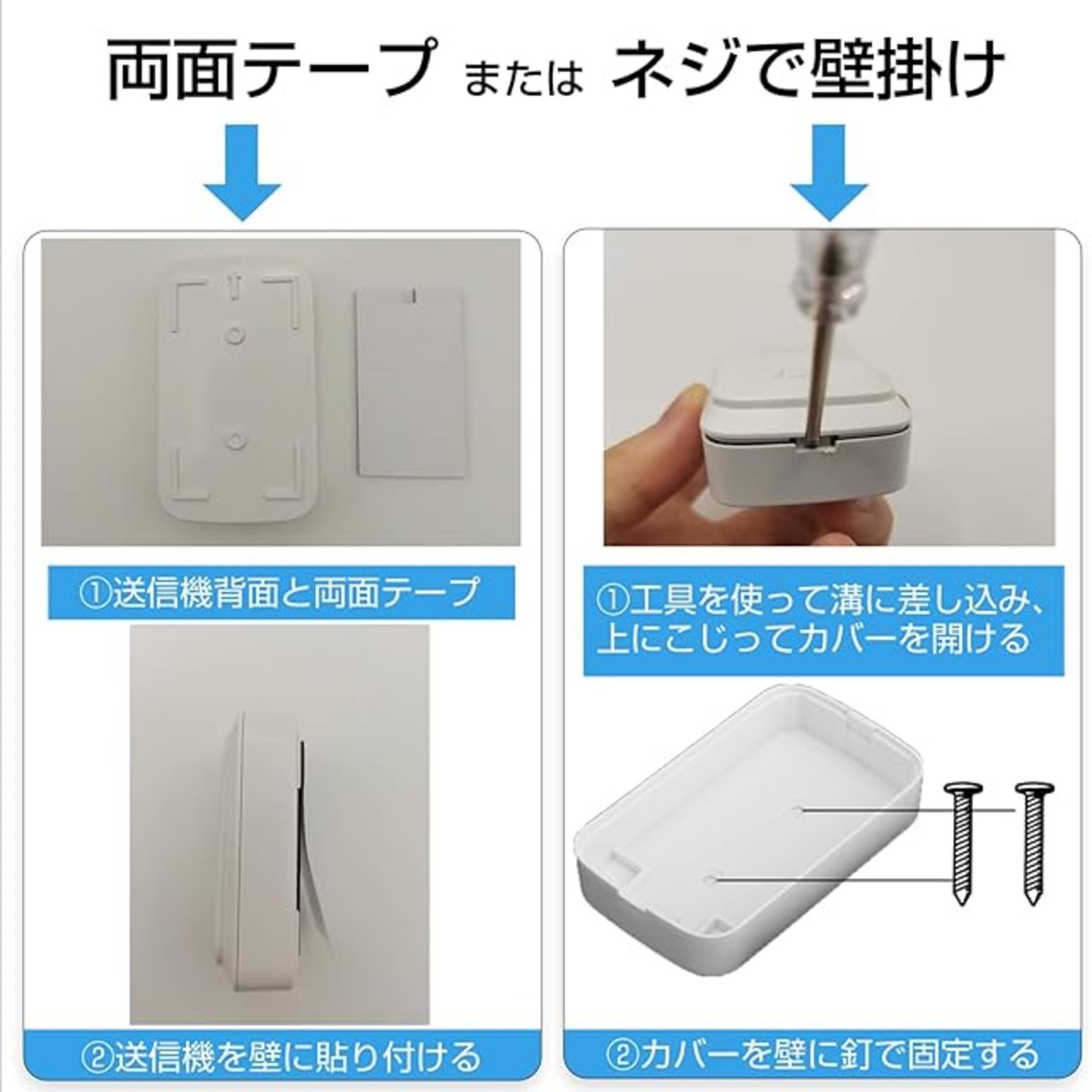 【取付簡単&IP44防水防塵】この玄関チャイムはネジと両面テープが付属しており、配線不要で簡単に取り付けることができます。IP44防水防塵構造を採用しており、送信機の表面に水をかけても大丈夫ですが、底の穴に水が入らないように注意してください。
