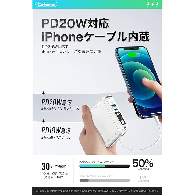 ▼【2本急速充電ケーブル内臓】PD18W対応Type-cケーブルとPD20W急iPh用ケーブルが内臓されて、接続するだけでフルスピードで急速充電します。30分でiphone14を約50%を充電できます。外出先で急速ケーブルがなくてもササッと充電を体験します。それにUSB-Aポートは一つが搭載、ケーブルが接続すれば、3台デバイス同時充電可能になります。iPadや iPhone、Galaxy同時お持ち方におすすめします。