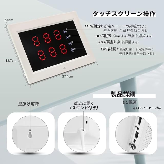 【機能紹介】高輝度LED 呼び鈴 ワイヤレス、接触式スクリーン、小型軽量、場所をとらない、卓上/壁掛け用。2組の3桁表示、番号設定:001-ZZZ(数値:0-9,英字: A-Z)。9段階の音量調整。発音モード:ビープ音(7種類)/英語発音。放送回数調整可能: 1~99回。