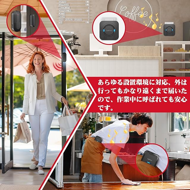 【あらゆる設置環境に対応】このドアベルチャイムセットには、電源プラグ式と電池式の2種類のドアベルが付属しています。電源が必要な環境でも、電源のない遠隔地でも、適切なドアチャイムをお選びいただけます。AC式受信機はプラグを差し込むだけの簡単な設置。電池式の場合も、電池ボックスに電池を入れるだけです。外は行ってもかなり遠くまで届いたので、作業中に呼ばれても安心です。お店舗、事務所等場所で防犯ブザーとして又はドアベルとか徘徊センサーなととして利用できます。