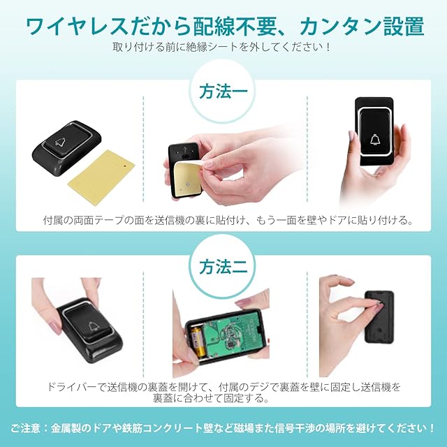 【使用簡単&省エネ設計】無線チャイムで複雑な配線工事が不要です。電池交換の不便もなく、ドアチャイム受信機はコンセントに差し込むだけで、送信機をドアフレームに固定し(両面テープでの接着可能)ボタンを押すだけでチャイムが流れます。設置が簡単で手軽です。このチャイムは超低消費電力設計を採用しとり、省エネと持続利用に優れています。