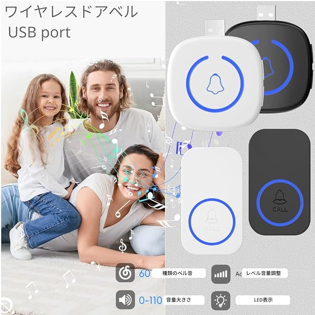玄関チャイム ドアベルキット ワイヤレスチャイム ドアベル HAB 工事不要 USB式電源 60メロディー 5段階音量 ワイヤレス通信が最大300メートル 呼び鈴 玄関 自宅 ナースコール 事務所 工場 介護現場 店舗 レストラン 居酒屋 受信機1個 送信機1個