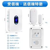 DAYTECH(デーテク) LC01ドアチャイムは事業所の来客対応、高齢者の外出予防、防犯などに活躍しています。音の出る本体が無線で部屋にいる場所のコンセントに設置するだけで来客が必要な音量と気に入った音質で分かります。 <特徴> ■音量と音色調整できる:5段階(0-110dB)音量調節でき、チャイムをコンセントに差し込む際に音量はミュートモードですので、急に怖くなる心配はないです。音色も55種類調整できます。 ■音色記憶機能:ドアチャイムにメモリ機能が付いているので、停電後でもメロディーの元の選択であるため、リセットの手間を減らすことができます。 ■取り付けが簡単:開閉センサーを玄関ドアに貼り付け、受信機をコンセントに刺すだけなので、非常に簡単に取付出来ます。 ■増設できる開閉センサー:違いセットもペアリングして使用できます。1台の受信機は最大20台のマグネットセンサーを増設でき、マグネットセンサーは複数の受信機と増設できます。 ■100M受信距離:障害のない場所でワイヤレス通信が最大100メートルの長距離まで届けます。広い家でも安心できます。来客対応などに最適、チャイムで離れた場所にお知らせ。 <基本情報> ■外形寸法(約):受信器 幅65×高さ95×奥行40(mm)(最大値) ドアセンサー送信器(本体) 幅30×高さ65×奥行10(mm)(最大値) ■質量:受信器 約72g ドアセンサー送信器(本体) 約34g(電池含み) ■電源:受信機 100-260V,発信機 12V 23A電池1本(付属) ■電池寿命:約1年(1日に100回使用) ※電池の性能、使用条件により電池寿命は短くなる場合があります。 ■電波到達距離:見通し約100m。 ■使用温度範囲:-30℃~70℃ ■付属品:取付ネジ 2本、両面テープ大1枚 小1枚、日本語説明書1本