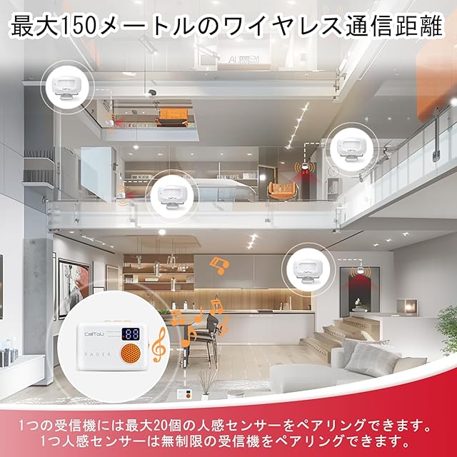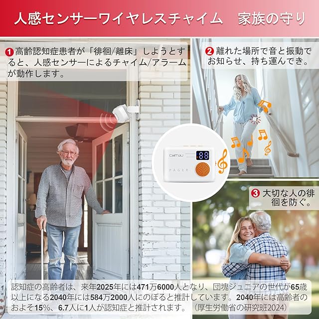 「CallToU」は、高齢者のための呼び出システムのブランドです。愛する人が独立した生活を送り、尊厳を保ちながらできるだけ自立した生活を送ることを支援するために努めています。そして、あなたのストレスを和らげ、安心感を提供します。高齢者や必要な人々が適切な支援をより早く受けられるよう、必要な時はいつでもお手伝いできます!</p> <p> ★【ボタンを押せない人に】送信センサーは人感センサーのデザインで、手や指先にチカラが入らないまだ麻痺してる人に利用できます。センサーに手をかざすと反応すると無線で離れた場所の受信チャイムでお知らせします。離床センサーとしても利用でき、ベッドから足を降ろすと、無線でお知らせします。無線は屋外150メートル、屋内90メートルで、一般的な住宅なら問題なく届きます。 </p> <p> ★【多機能を付けるドアベル受信機】従来の呼び出しベルより、進級して、いろな機能を付けます。持ち運びやすいデザイン、いつでもどこでも使用可能、クリップ付きで装着が簡単、5段階の音量調整、環境に合わせて自由に調整可能、2種類の音楽スタイルから選択可能、ロ一バッテリ一警告機能、突然の電源切れを回避、前に配置されたスピーカーデザイン、音量が圧縮されるのを防ぐ、サイレントモード対応、静かな環境での使用が可能です。</p> <p> ★【電池式、取り付け簡単】●電波を利用したワイヤレスチャイムはセンサー式で非接触、ボタン押し型より衛生的、玄関や店舗などの入り口につけて人の出入りをお知らせに最適なドアチャイムです。送信センサーと受信機に3本の単4電池を入れるだけ、どこにでも取り付けられます(★バッテリーは付属)。</p> <p> ★【ロ一バッテリ一警告&増設可能】徘徊防止センサーと携帯受信機は電圧が低下すると、受信機は赤または青に点滅します。赤は受信機の電池交換が必要を示し、青は送信センサ一の電池交換が必要を示します。また、増設は自由、後から追加ができます。徘徊の可能性を無線でお知らせするシステムです。出入口、玄関、窓などにセンサーを取り付け、徘徊の可能性があると音や光でお知らせします。</p> <p> ★【5段階の音量調整】呼び出しベル受信機は5段階の音量は、ニーズに応じて音量を調整でき、大きすぎておびえることはありませんし、小さすぎて聞こえないことはありません。耳が遠い方に便利です </p> <p> ★【大活躍】●来客時のドアチャイムとして、●お年寄りや体の不自由な方の呼び出しベルとして、●各部屋間の呼び出しに、●店舗、事務所、工場や倉庫など騒音場所での呼び出しになど幅広い場所に適用できます。</p> <p> ★【メーカー保証】ご購入日から1年間品質保証が付いております。商品到着後、欠品、破損、初期不良および通常使用範囲内で発生した故障やその他の不明点などがあった場合は、「Amazon注文履歴」→「出品者に連絡する」から弊店にご連絡ください。誠心誠意に対応をさせて頂きます。