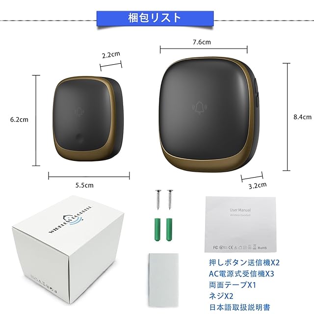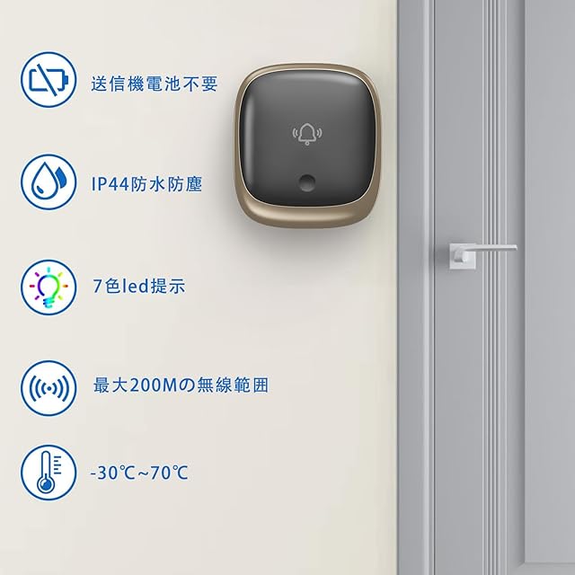【ラクラクな取付】無線チャイムで配線工事が不要です。電池交換の不便もなくて、ドアチャイム受信機はコンセントに差し込むだけで、送信機をドアフレームに固定し(両面テープでの接着可能)ボタンを押すだけでチャイムが流れます。設置が簡単で手軽です。お子供や年寄りの方もご利用できます。うちのワイヤレスチャイムはご自宅、お風呂、介護現場、飲食店はもちろん、事務所や倉庫などで活躍します。
