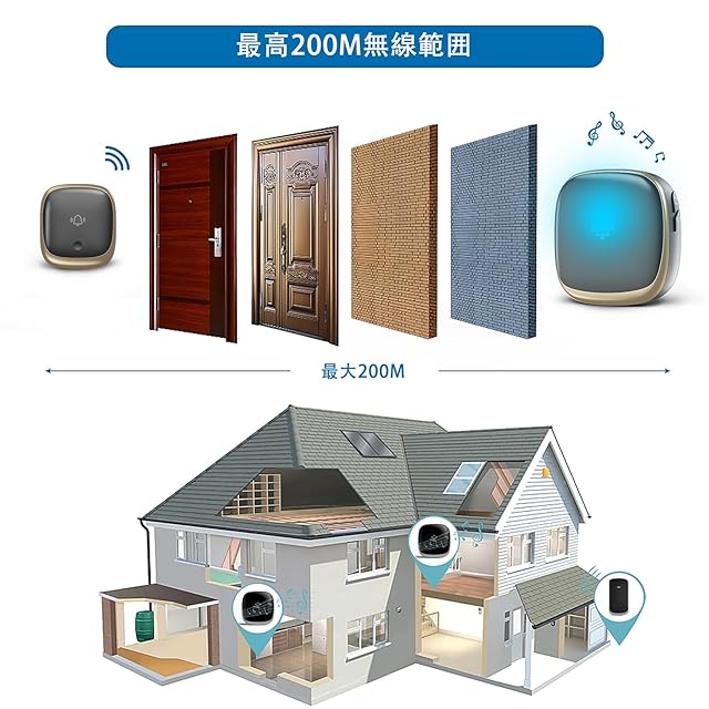 【200m無線範囲&4段階音量調整】このドアベル呼び出しセットは高感度の受信機を採用して、壁、木ドアー、鋼ドアーなどに安定受信でき、2階建ての建物でもご使用いただけます。障害のない場所でワイヤレス通信が最大200メートルの長距離まで届けます。広い家でも安心できます。介護などに最適、チャイムで離れた場所にお知らせ。