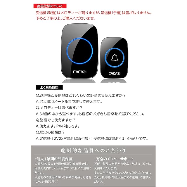 サイズ(発信機):75mm×51mm×20mm、 サイズ(受信機):95mm×65mm×24mm、 本体素材:ABS樹脂、 無線転送距離:最大300メートル メロディ:全60メロディ  音量:4段階音量調整、 給電方式:発信機-12V23A電池(単5付属)/ 受信機1個あたり-単3電池×3(別売り)、 防水・防塵:IP44等級防水防塵性能 【発信機の取付】両面テープ、ネジ固定 ※音声通話機能無し