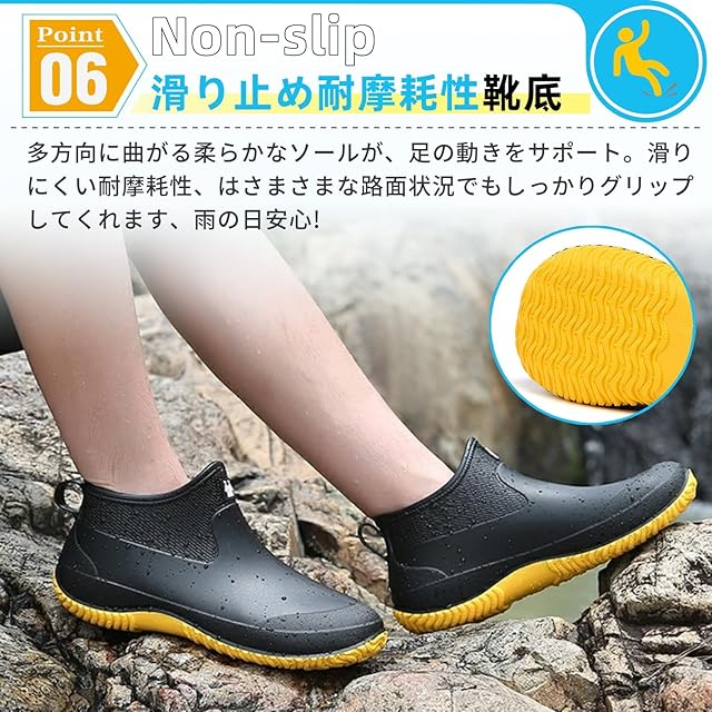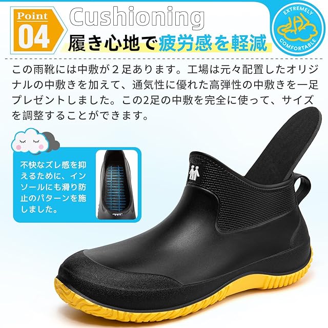【履き心地の改良】軽量設計足元の負担を軽減。雨の日でも軽快に歩けるよう、軽量化を実現。工場は元々配置したオリジナルの中敷きを加えて、通気性に優れた高弾性の中敷きを一足プレゼントしました、靴内部のムレを軽減します足に掛かる負担を分散。屈曲性に優れ、足が動きやすくなり、長時間の歩きでも足の疲れが溜まりません。