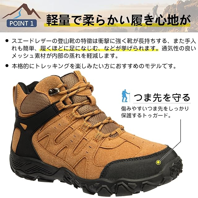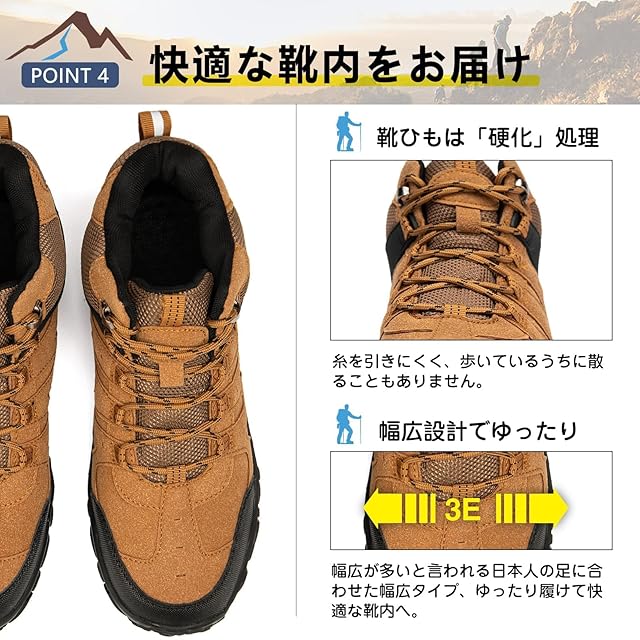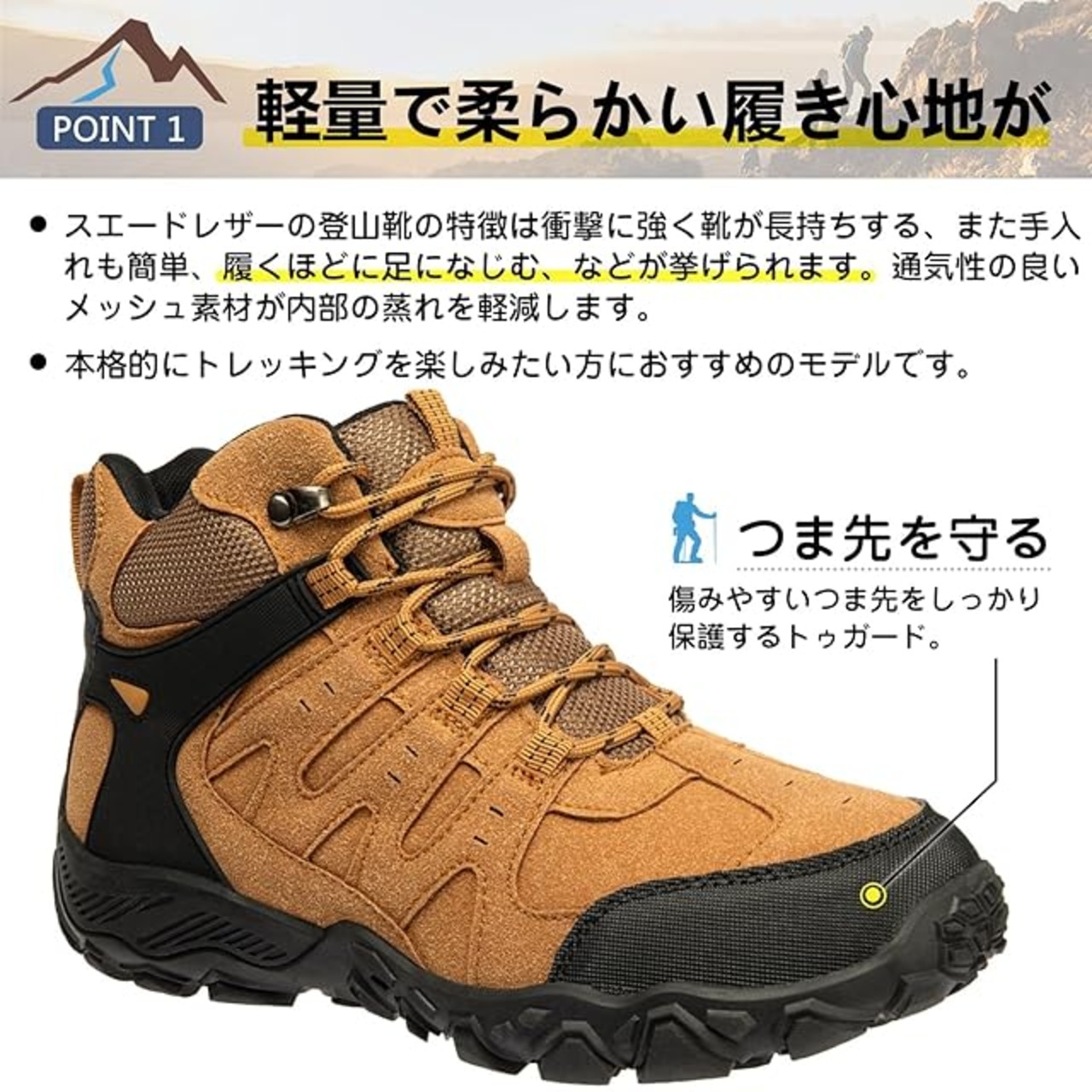 高耐久性で過酷な環境にも対応 登山やハイキング、キャンプなどの厳しい環境にも対応できる高耐久性の登山靴。高品質なラバーソールと強化レザーを使用し、岩場や泥道でも長持ちします。アッパー部分は高い強度を誇り、登山や山登りでも足元をしっかり守ります。過酷な環境でも長時間使用でき、アウトドアやハイキングに最適です。