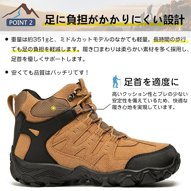 軽量設計で快適な動きやすさ 軽量設計の登山靴は、長時間の歩行でも足に負担をかけません。優れたクッション性と反発性で、足元をしっかりサポートします。軽やかな履き心地で、登山やハイキングはもちろん、普段のウォーキングや旅行にも最適です。