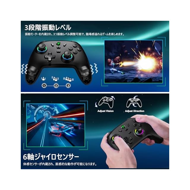 【充電ベースを搭載した多種機種対応Switch コントローラー 】洗練なるソリッドブラック、6色変換LEDライト、充電ベース搭載、ホールジョイスティック、3段階Turbo連射速度、3段階振動、Bluetooth5.0接続、6軸ジャイロセンサー、スクリーンショット、自動連射機能/連射ホールドなど、様々な機能が今までと異なるゲーム体験が楽しめます。高い交換性を持つ、スイッチ全モデル「Switch/Lite/有機ELモデルなど」に対応でき、すべてのSwitchゲームに適しております。さらに、Android/iOS13.0+/PC Windows7/8/10+にも接続可能で、switch コントローラー 無線はAndroid HIDモードゲームとiOS MFIプロトコルゲーム(iOS13.0以降)をサポートしており、有線接続を介してX-InputモードゲームやSteamゲーム(Windows 7以降)もプレイすることができます。