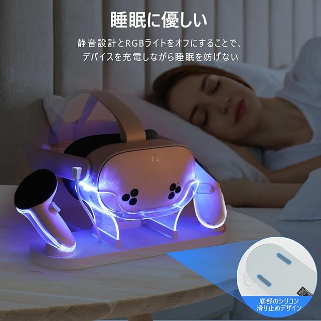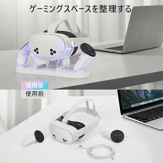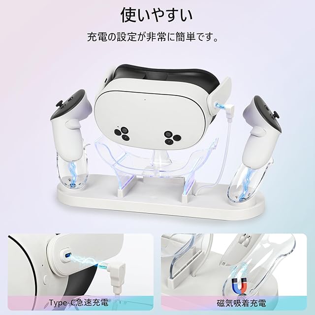 【便利な設計】メタクエスト3S本体とコントローラーを整理整頓できる専用充電スタンド。磁気吸着充電で簡単に装着でき、コンパクトに収納できます。