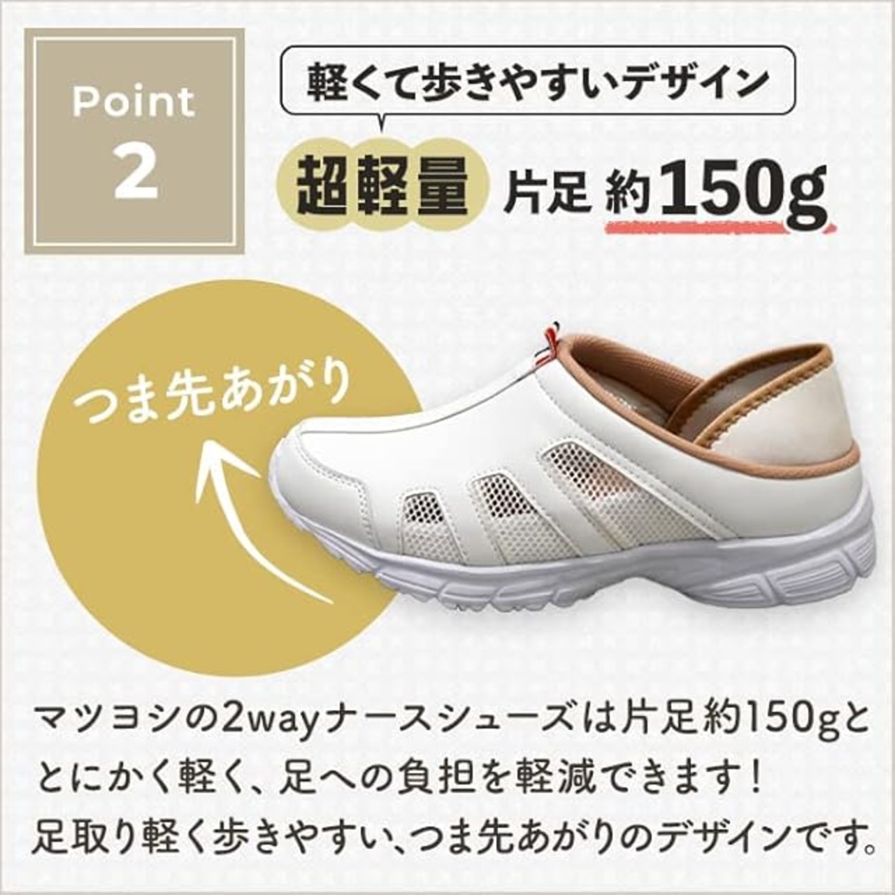 【超軽量の片足約15g】マツヨシの2wayナースシューズは片足訳150gととにかく軽く、足への負担を軽減できます!足取り軽く歩きやすい、つま先上がりのデザインです。