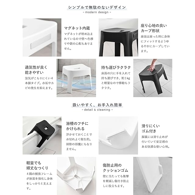 マグネットで浮かせて収納できる、便利なバスグッズ2点セット。浮かせることでスペースを取らず、水切れも良く乾燥もバッチリ!凹凸が少ない洗いやすい形状なのでお手入れしやすいのも嬉しいポイントです。座面は座った時にお尻を包み込むようゆるやかにカーブしており、座り心地よく快適なバスタイムをお過ごしいただけます。セットで揃えることで統一感が生まれ、浴室がスタイリッシュにまとまります。新築祝いなどの贈り物にもおすすめです。
