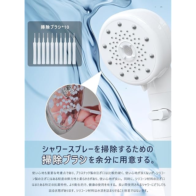 【一滴の水に滑らかさが宿り、かつてない楽しさを】 散水板の穴の大きさ、配置、速度などを徹底的に研究してシルクのように極め細やかな浴び心地の両立を実現。このシャワーヘッドは注ぎ口が従来のプラスチック製からシリコン製に出水孔されている。 これにより、目詰まりによるシャワーヘッドの吐水口の傾きが大幅に改善された。シャワースプレーを掃除するための掃除ブラシを余分に用意する。