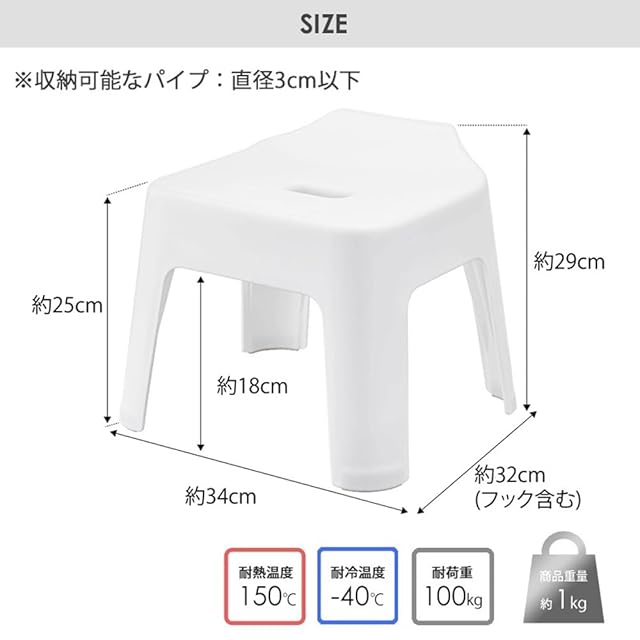 [仕様]完成品、生産国:中国、【風呂イス】耐荷重:約100kg、耐熱温度:150℃、耐冷温度:-40℃、収納可能なパイプ:直径 約3cm以下、【湯おけ L】耐熱:120℃、耐冷:ー40℃、容量:3.8L