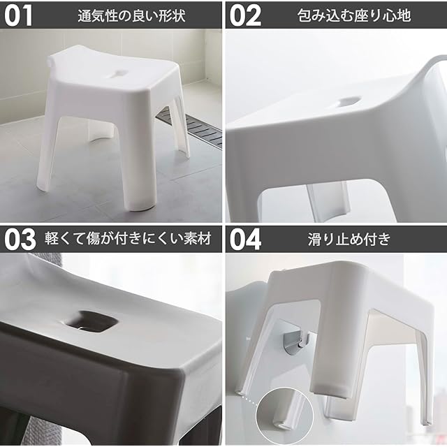 水分を素早く乾燥!浴室の壁面にマグネットでくっつく湯おけとタオルバーやシャワーフックにも浮かせて収納もできる風呂イス(座面高25cm)のセットです。 丁度よいサイズ感と濡れた手でも持ちやすいデザインの湯おけ。使い終わったらそのままマグネットで壁に浮かせて収納が可能です。フック付きなのでタオルバーやシャワーフック、浴室の扉のハンドルに引っ掛けておけるのも◎ 通気性抜群の風呂イスも座りやすいデザイン。大きめの座面穴で水切れも良く乾燥もバッチリです!イスの後ろに突起が付いているのでシャワーフック(2.5cm以上)に浮かせて収納できるのも嬉しいポイント♪ オシャレで実用性も兼ね備えた『湯おけ』と『風呂イス』のセットで、すっきりスタイリッシュにまとまり快適なバスタイムが過ごせますよ♪ 新築祝いなどの贈り物にもオススメです。