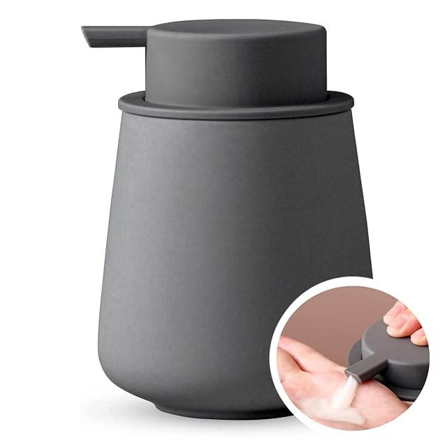 【NEW肌感新工法】本ソープディスペンサーのボトルは高品質のセラミックで作られ、内部は食品級の白釉、外部は北欧のゴム塗装の肌感新工法を採用しています。肌のような質感で肌触りがとても心地よいし、彩度の低い色で、癒しとリラックス感を与えます。また、底部もゴム塗装で完全に覆われています。台に傷つけることがありません。※ゴム塗装の摩耗を防止するため、ざらざらした台の上に置くことは避け、鋭利な物で傷をつけないようにしてください。※油性、酸性、腐食性の液体に近づけないでください。