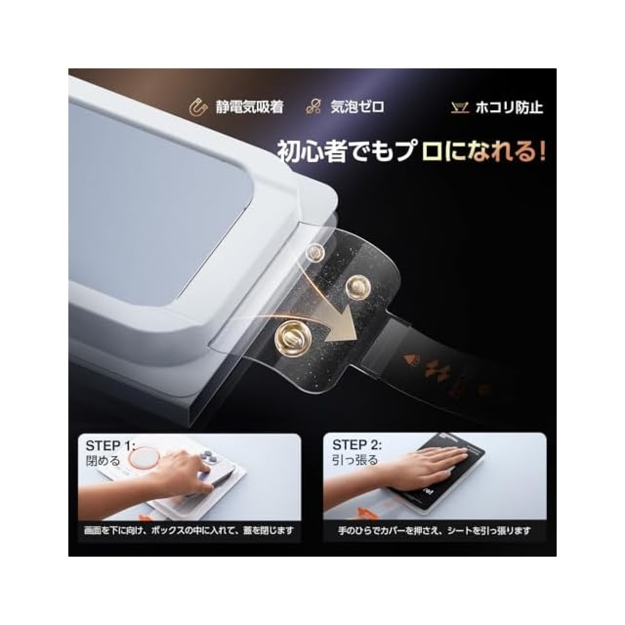 【最新なフィルム貼り付けデザイン】2ステップだけで簡単に貼り付け!ガイドボックスにスマホを入れて、蓋を閉めて、ホコリ除去シートを引っ張ると貼り付け完了です!