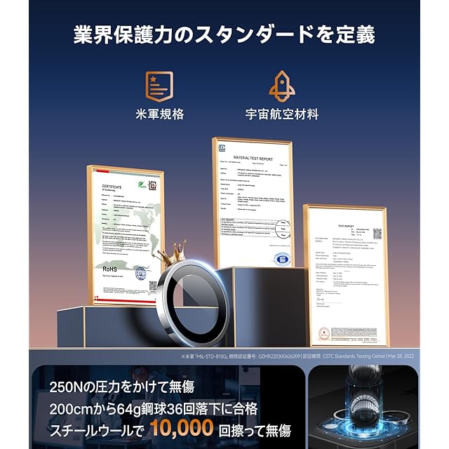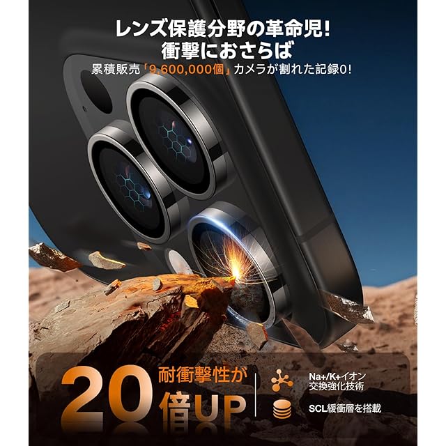 【宇宙航空材料・米軍規格からの保護力】 航空宇宙材料を駆使し、カメラフィルムはNa+/K+イオン交換技術やSCL緩衝層など、30種類以上の革新的な加工技術を採用。これにより、表面に圧縮応力層を形成し、耐衝撃性が20倍以上に強化された。特にiPhone 16 Pro用・16 Pro Maxのレンズが衝撃を受けた際には、その力を瞬時に分散させ、あらゆる方向からの衝撃にも対応。iPhone 16 Pro・16 Pro Maxのレンズ割れを徹底的に防ぐ。表面硬度は9H超え、日常使用の中で発生しがちな過酷な衝撃、圧力、摩擦にも耐えることができる。iPhone 16 Pro・16 Pro Maxのレンズレンズをしっかりと守る。10年以上にわたる保護技術の進化と革新の結晶として、累計9600万枚以上が20カ国で販売され、その間に一度もレンズ破損の報告がなかったという実績を持つ。※米軍「MIL-STD-810G」規格認証取得済みで、認証番号:GZMR220300626209|認証機関:CSTC Standards Testing Center|認証日:2022年3月31日。