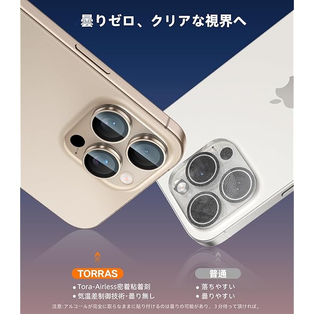 【あらゆるケースにピッタリ!貼りやすい!】iPhoneのカメラサイズを元にし、精密加工で作られた独立設計のiPhone 15Pro・15Pro Max用レンズフィルムでは、あらゆるケースに干渉しなく、お気に入りのケースを好きなだけ選べる。組み合わせて使用し、シンプルな美しさで、あなたのセンスをさり気なく表現!押してはめ込み、外し、終了!驚くほどほどの貼りやすい!成功率100%、初めてフィルムを貼る素人でも、楽に貼り付けできる。さらに、Tora-Airless特殊粘着剤を採用し、レンズ本体とピッタリ密着!