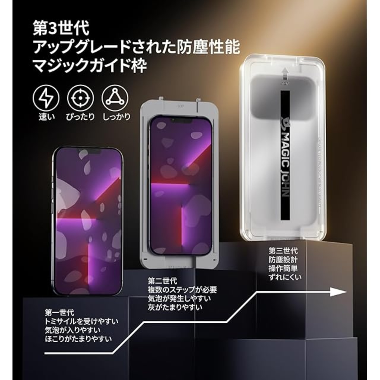 【もう失敗はしない】本製品はiPhone 13promax/14plus(6.7インチ)に対応するガラスフィルム2枚セットです。百万以上の欧米ユーザーのフィードバックを集めて日々改善したマジックガイド枠は技術の革新だけではなく、匠の精神を求める結晶です。操作が簡単でずれにくく、一歩だけで保護フィルムを貼り付けます。そのうえ、自動ホコリ取りデザインだけでなく、マジックガイド枠のスロープデザインで、空気を効率的に取り除くことができ、初心者でも気泡レスのまま綺麗に貼れます。