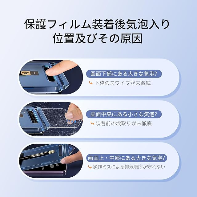 【もう失敗はしない】本製品はiPhone15に対応するプライバシーフィルム2枚セットです。百万以上の欧米ユーザーのフィドバックを集めて日々改善したガイド枠は、3歩だけで保護フィルムを貼り付けます。そのうえ、自動ホコリ取りデザインだけでなく、ガイド枠のスロープデザインで、空気を順序に取り除くことができて、初心者でも気泡レスのまま綺麗に貼れます。