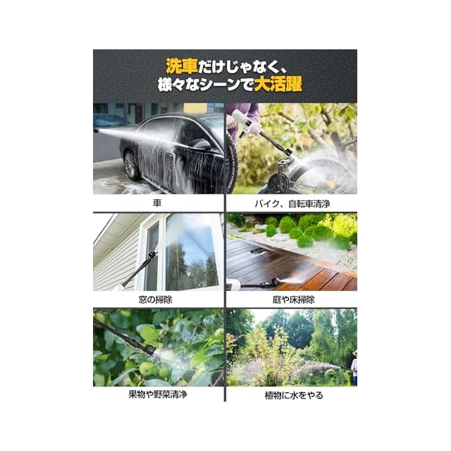【洗車や大掃除に便利&調節可能】高圧洗浄機はブラシや雑巾といったほかの掃除道具と異なり、水を当てるだけなのでラクに掃除ができる点が大きな魅力です。2段階水压モードがあり、射程は最大10メートル、強力な水圧によって、長年蓄積したガンコな汚れを落とすことにもできます。オプションパーツは豊富で、自吸機能つきで汎用性が高く、小型のため持ち運びやすく、射を切り替える6in1ノズルや、洗車に便利な左右360°上下180°変換ノズル、フォームノズルが付き、扇型の水流で効率よく洗浄できます。車の下回り・雨どいなどの手の届きにくい場所の洗浄に適しています。一方、高圧ホースは接続しやすく、ノズルの先端を回転させることで6種類の水流を使い分けられる点は様々なシーンで大活躍!洗車や庭、屋外、階段、網戸・窓ガラス、ブロック塀、外壁、駐車場、玄関まわり、自転車・バイク、ベランダ、高い場所、家まわり、浴室、年末大掃除、キャンプ用品の清掃やBBQの片付けにも大活躍。