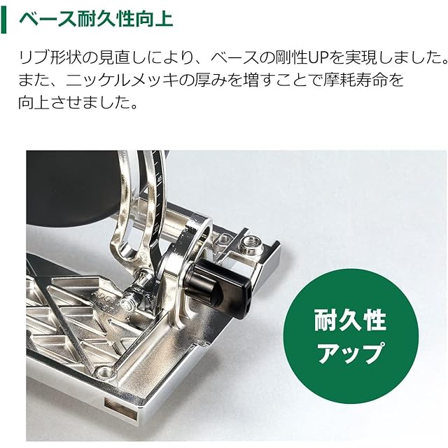 造作丸のこ同様の高剛性ダイカスト製ベベルピースを採用することで、高精度な切断を実現。また、ベースのリブ形状の見直しにより剛性アップ、ニッケルメッキの厚みをますことで摩耗寿命をアップ。