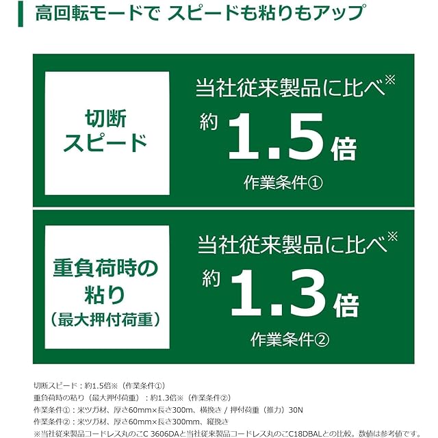 切断スピードが約1.5倍アップ ※従来品C3606DA比 作業条件:米ツガ材 (厚さ60mm×長さ300mm)/ 横挽き / 押付荷重(推力)30N