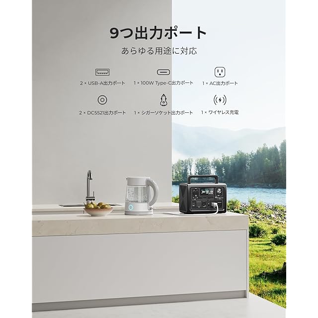 【超小型・高出力】家庭用AC(100V 600W)*2、USB-A*2、USB-C*1、5521DC*2、ワイヤレス充電*1、シガーソケット出力*1を含む9つの出力ポートから同時充電を行えます。また、電力リフト機能より、高出力な電化製品の出力を下げることが可能です。最大出力600Wですが、場合によっては600Wから最大1200Wまでの電化製品を動かすことができます。安全性が一番高いリン酸リチウム電池を採用し、充放電サイクル2500回後も残存量は80%以上を維持します。