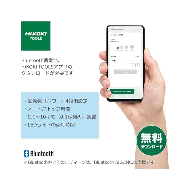 Bluetooh蓄電池使用時、HiKOKI TOOLSアプリとの連動で回転数、オートストップ時間、LEDライトの点灯時間が設定可能です。自分好みにカスタマイズ。