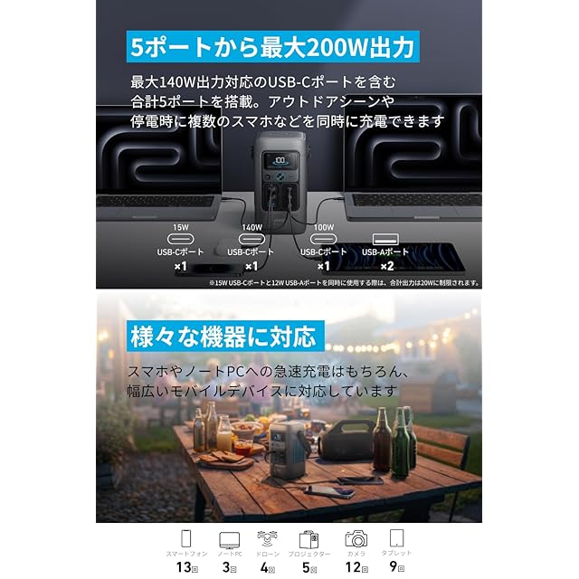 5ポートから合計最大200W出力:USB-C、USB-Aを含む合計5ポートを搭載し、合計最大200W出力が可能です。キャンプ時に複数のスマホなどを充電することができ、ノートPCへの急速充電はもちろん、カメラやプロジェクター、ドローンなど様々な機器へ給電 / 充電できます。 ※ACポートは搭載しておりません。 ※15W USB-Cポートと12W USB-Aポートを同時に使用する際は、合計出力は20Wに制限されます。