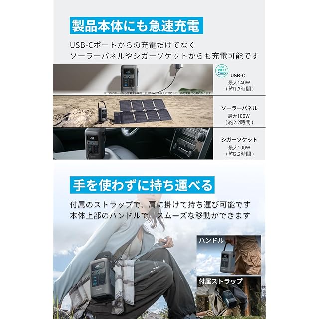 豊富な充電方法:USB-Cポート、ソーラーパネル、シガーソケットからの充電に対応し、多様な場面に合わせて充電方法をお選び頂けます。USB-Cポートからは最大140W入力で約1.7時間、最大100W出力のソーラーパネルを1つ接続で約2.2時間、シガーソケットを1つ接続で約2.2時間で満充電可能です。 ※USB-Cポートから充電する場合、別途18W出力以上に対応したUSB充電器が必要になります。