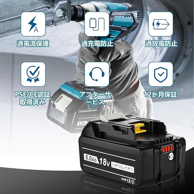 【 18v バッテリー 】型番:BL1860B 電圧:18V 容量:6.0Ah【四個セット】 種類:リチウムイオン電池高品質採用 多機能付き:バッテリーは残量表示が付いています。ダブル新機能付き:残量表示✙自己故障診断。 認証:PSEマーク CEマーク取得済み