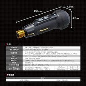 【仕様】本体サイズ:全長131×全高42×全幅42㎜/重量:170g/基本性能:正転・逆転、手締め機能、ブレーキ付、LEDライト/電池(内蔵式):リチウムイオン電池3.7V、850mAh/充電時間:約55分(当社EZ37C4・EZ37C5・EZ37C6の場合)、約60分(市販USB充電器5V 1Aの場合)、約45分(市販USB充電器5V 2Aの場合)/チャック:ワンタッチビットロック方式(段付までの寸法が9㎜・11.5㎜・13㎜)/適合ビット:六角ビット 対辺6.35㎜/締付トルク:<電動時>0.4N・m(剛性体最大締付トルク)、<手締め時>8.0N・m(最大耐久トルク)/回転数(毎分):850回転/付属品:ミニドライバー用ビットセット(黒染加工)、USB充電ケーブル(長さ50cm、USBType-A to USBType-C ※充電には市販品のUSB用ACアダプタが必要です)/カラー:ブラック&ゴールド
