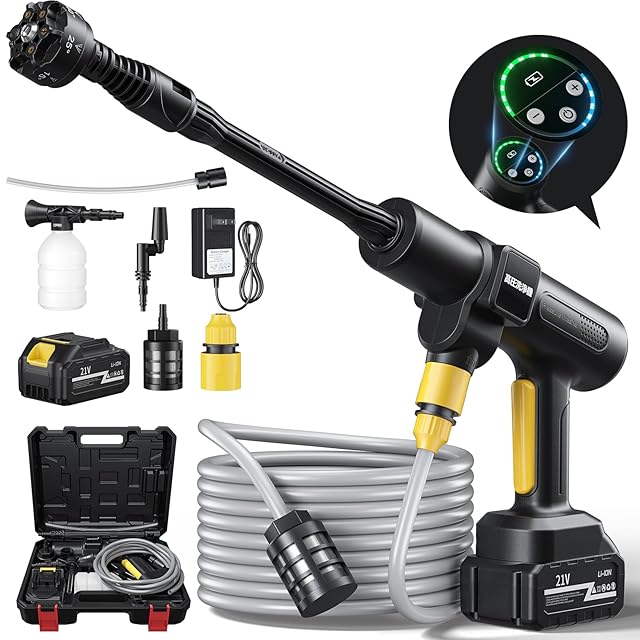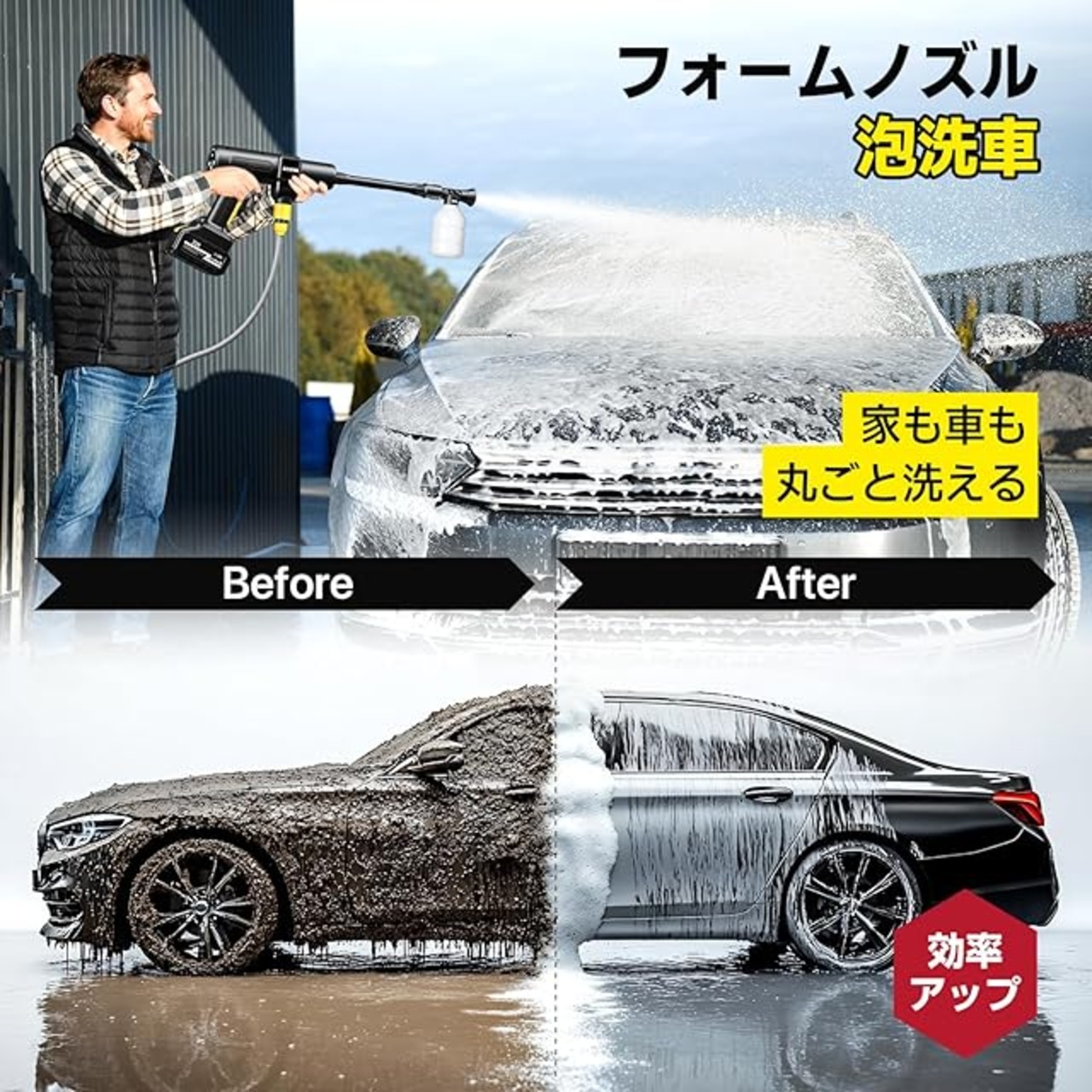 【洗車や大掃除に便利&調節可能】高圧洗浄機は高圧ポンプと高効率の750W純銅ブラシレスモーターを搭載し、水道水の40倍の圧力まで安定した強力な水圧を提供し、高圧噴射による頑固な汚れを簡単に除去します。他社製品に比べ、洗浄機は圧力が20%高いため、洗車時間が10分以上短縮され、効率的な洗浄が可能です。高圧洗浄機は一目でわかるディスプレイ画面搭載、画面の表示により、モード調整や電池残電確認ができます。ハイパワーが実現され、しかも省エネ!低騒音デザインの高圧洗浄機で、水圧を調節できる家庭用モデルなので洗車だけじゃなくさまざまな汚れをラクに掃除!2段階水压モードがあり、射程は最大10メートル、強力な水圧によって、長年蓄積したガンコな汚れを落とすことにもできます。 弾力性があるので洗浄作業中も楽々給水ホースに専用フィルターを利用し、ゴミなど不純物の混入を防ぎます。