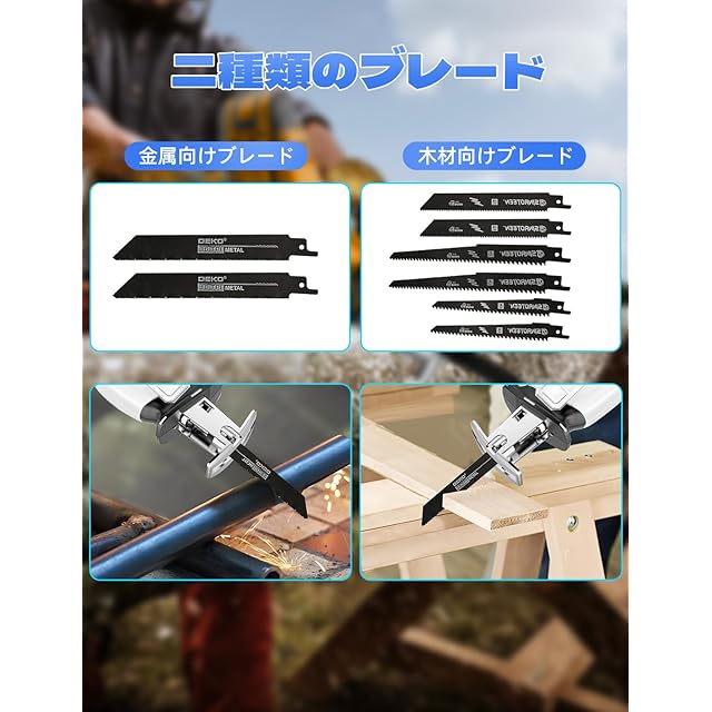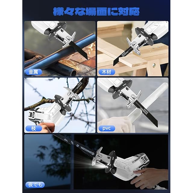 【様々な場合に適用】▲付属品:レシプロソー本体x1、4000mAh大容量バッテリー×2、充電器x1、木材用の刃6本、金属用の刃2本、計8本の替え刃がセットに含まれています、収納ケースx1、日本語取扱説明書x1、保護メガネ×1、手袋×1。ニーズに応じ、ブレードを選択でき、様々な用途に対応できます。DIYや庭木の剪定、家具の解体 、粗大ゴミ解体、竹林整備、金属切断、薪作りなどいろんな分野に大活躍!