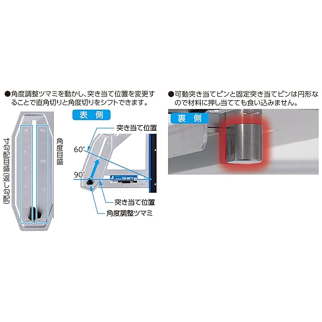 製造国:日本 直角度:100mmにつき0.1mm以下 角度調整範囲:45から90° 寸勾配調整範囲:1から10寸勾配(返し勾配) 材質:本体アルミ、ガイド面・固定突き当てピン・指針ステンレス、大型ハンドル:ABS樹脂、エラストマー樹脂、角度調整ツマミ:フェノール樹脂、真鍮