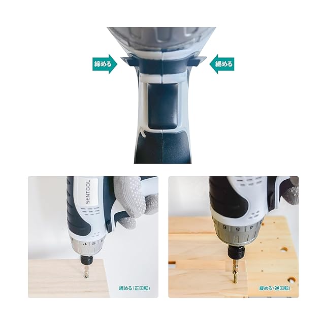 【無段階変速&正逆転切替】 充電ドライバー 無段変速機能が搭載され、トリガーの引き加減によってスピード調節が可能です。手元のスイッチを押すだけで簡単に回転方向を切替出来ます。