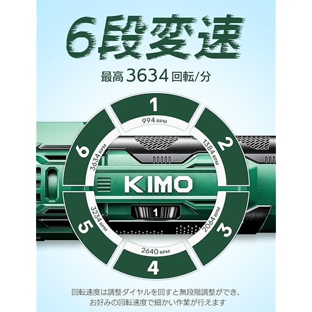 【6段変速】KIMO 5005 電動ポリッシャーの1段-6段の回転速度は994/1384/2064/3634/3634/分(RPM)に正確に制御でき、異なる材質と研磨ニーズに応じて最適な回転速度を選択でき、繊細な研磨効果を確保できる。調整ダイヤルを回すと無段階調整ができ、低速と調整した速度がワンタッチで切り替わり、好きな回転速度で細かい作業ができます。