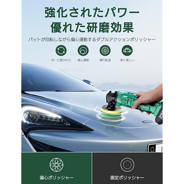 【充実な付属品&様々な場合で活躍】弊社のポリッシャーはお客様のニーズに合わせて充実なアクセサリーをご用意しております。本体、2.0Ahバッテリー*2、充電器*1、収納袋*1、サンドペーパー*8、交換用研磨ディスク*2、ウールバッファーパッド*2、マイクロファイバーパッド*2、平面スポンジ*3、波形スポンジ*3、取扱説明書を付属しております。