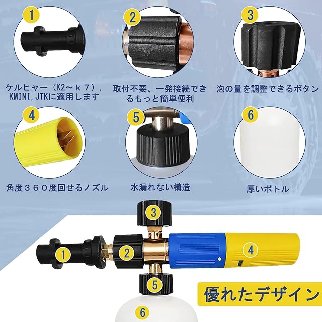 【優れたデザインのケルヒャー 泡 フォームガン】本ケルヒャー 泡 フォームガンは改善版でコネクターの取付不要で一発で接続できます。水漏れ防止のテープをくるくる手間がなくて、もっと簡単便利です。 ケルヒャー フォームノズル は角度360度回せるので、発泡の量と角度は調整可能です。 容量1L、半透明なボディ本体は残る量を確認できて大型の車なども一回の操作で洗車します。 ご注意:接続部はoリング設計なので、左右に振ると自動的下向けになります。